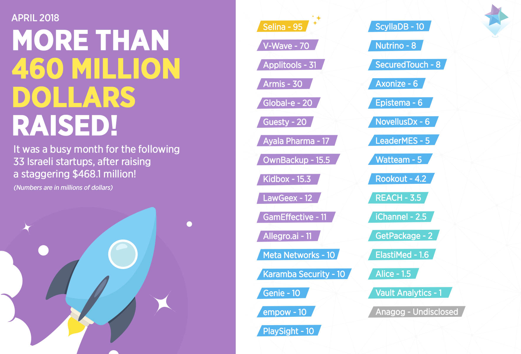 April ended with not over 33 deals (That we know of), and with great numbers! To be more accurate, 33 Israeli startups raised $468.1 million this month. Awesome!