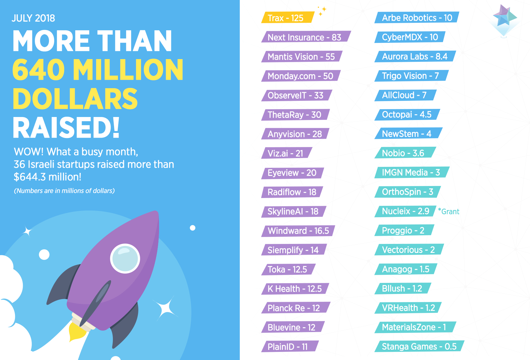 Wow, July was crazy. Not only we witnessed some exists, like Datorama being sold to Salesforce for $800 million or 10bis sold to Takeaway.com for $157 million, but also 36 startups (That we know of) raised the total amount of $644.3 million.